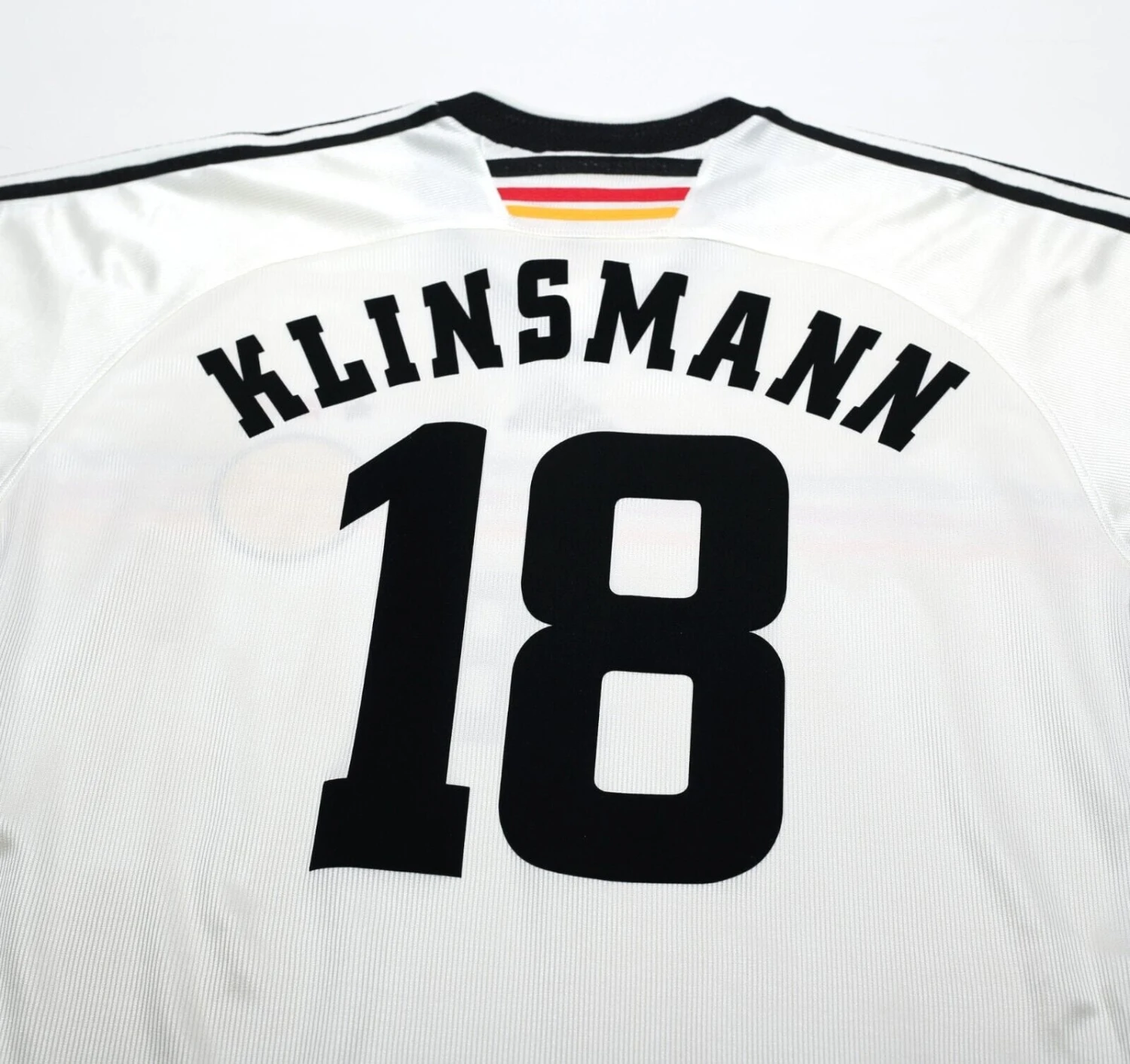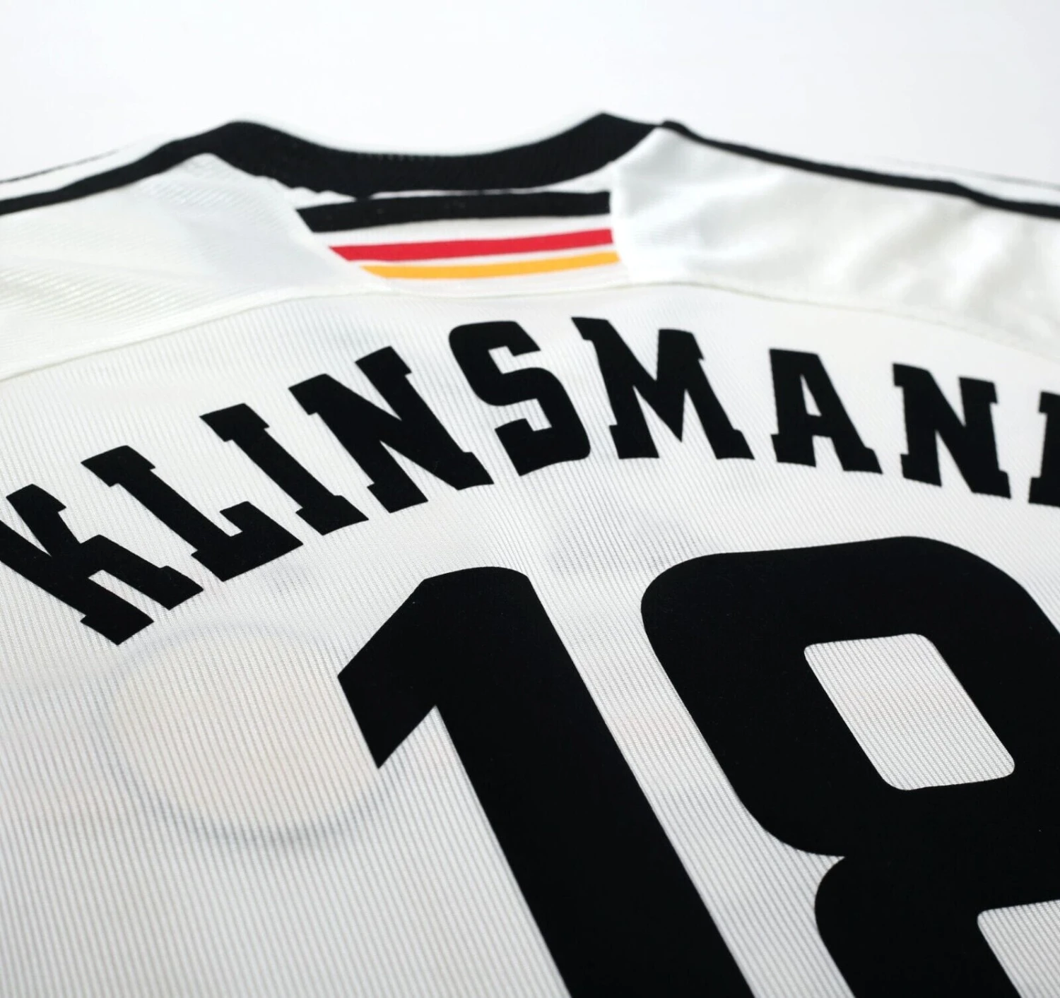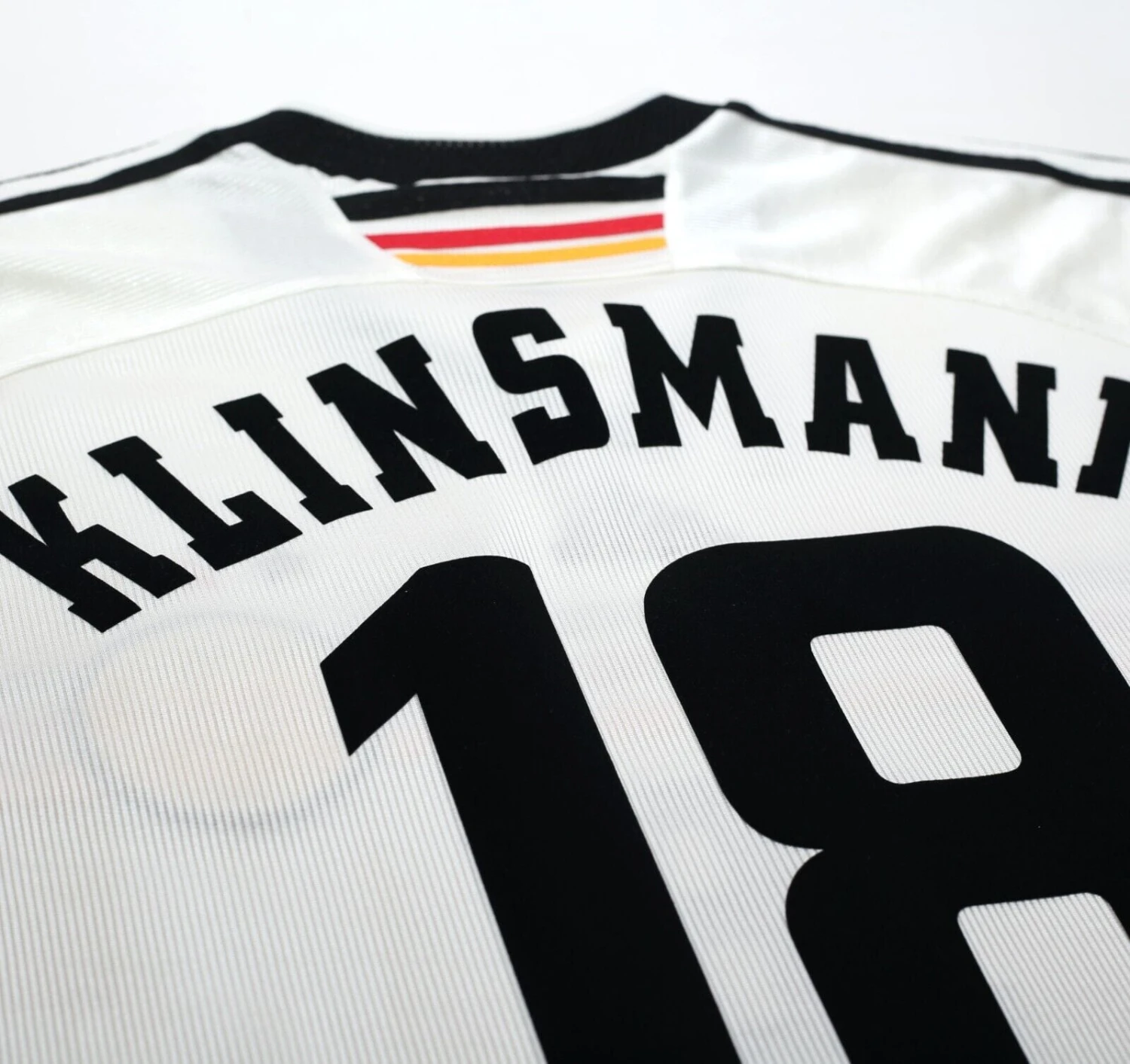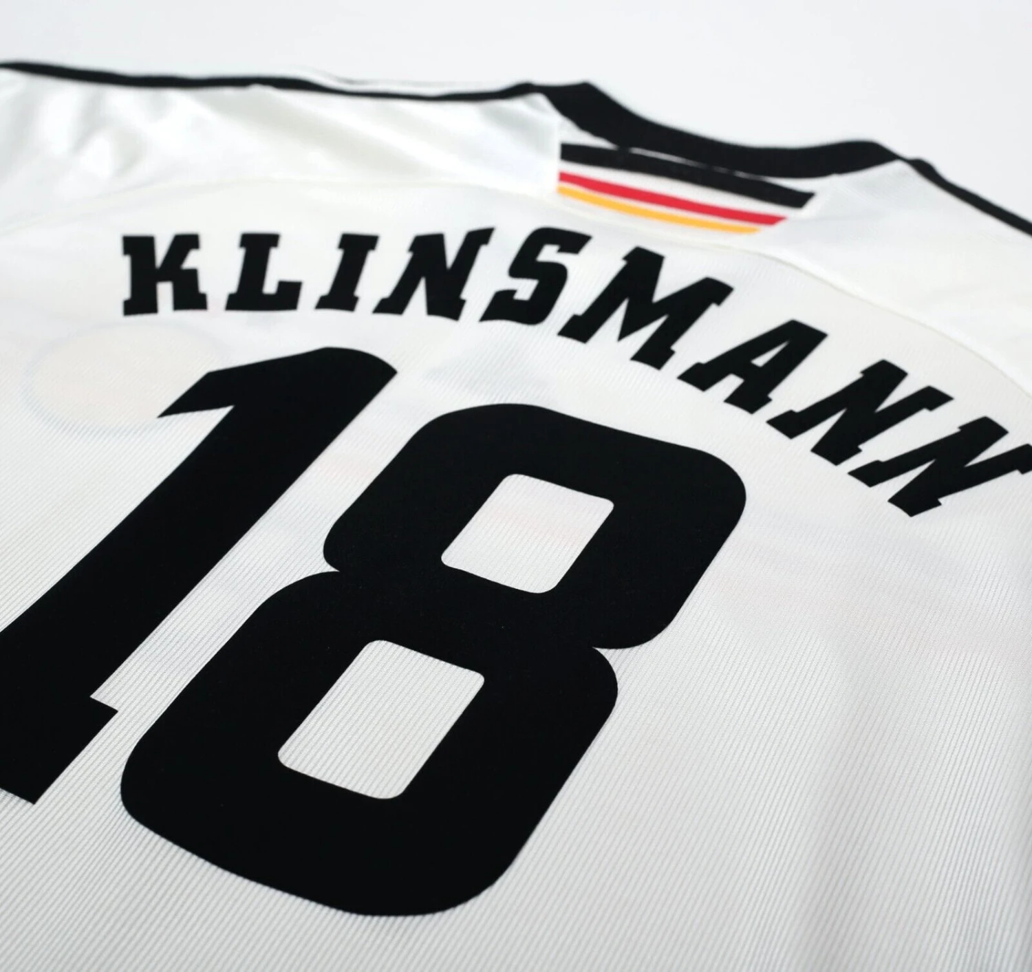Original style flock print for legendary striker Jurgen Klinsmann #18 as worn during the France 98 FIFA World Cup.
